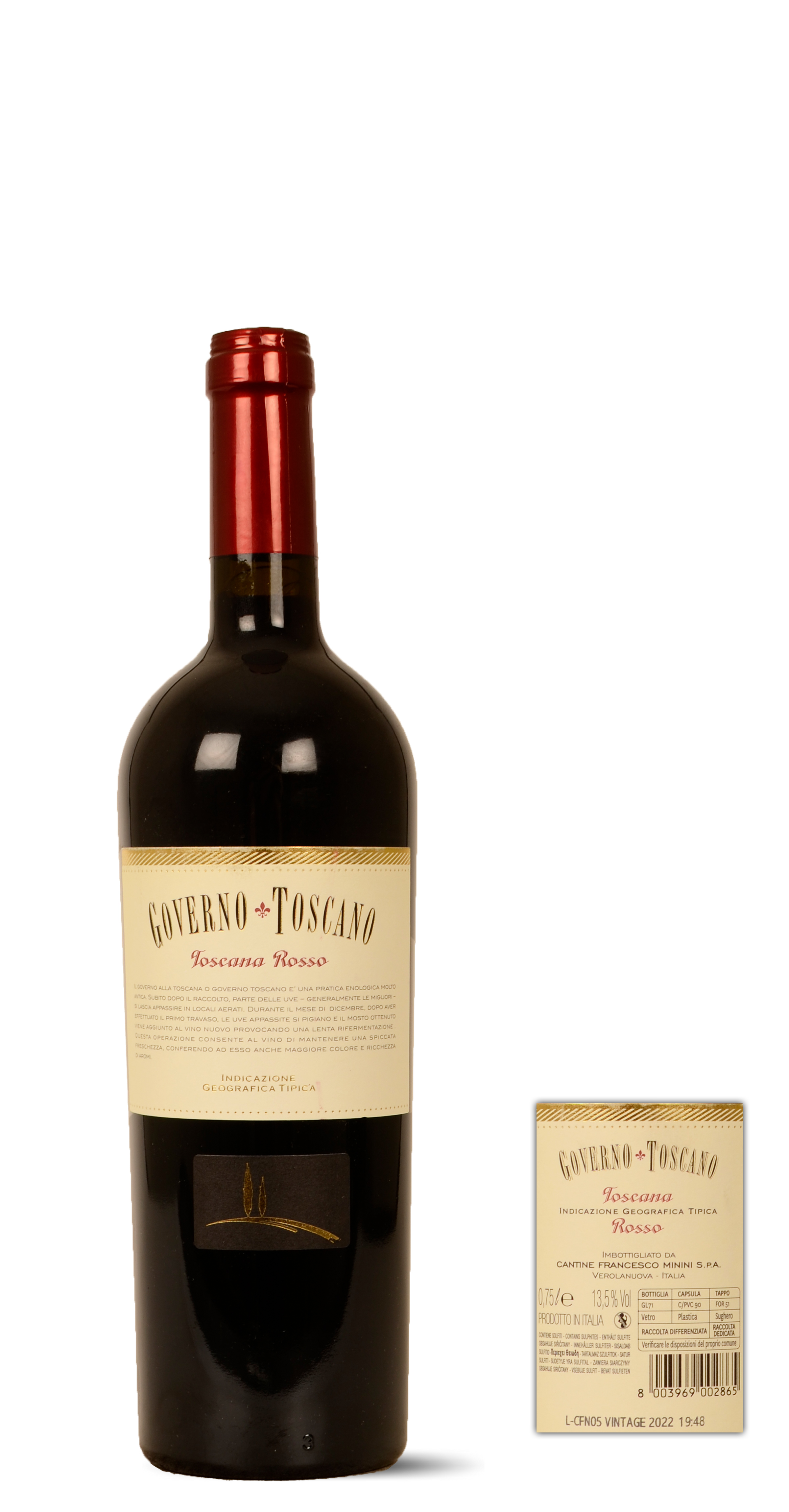 100% Sangiovese. Na de pluk worden de druiven voorzichtig geperst en ondergaan ze een maceratie op de pelletjes. Onder gecontroleerde temperatuur wordt de fermentatie opgestart in inox vaten. Na een 10-tal maanden van rijping op dezelfde vaten wordt de wijn gebotteld.
